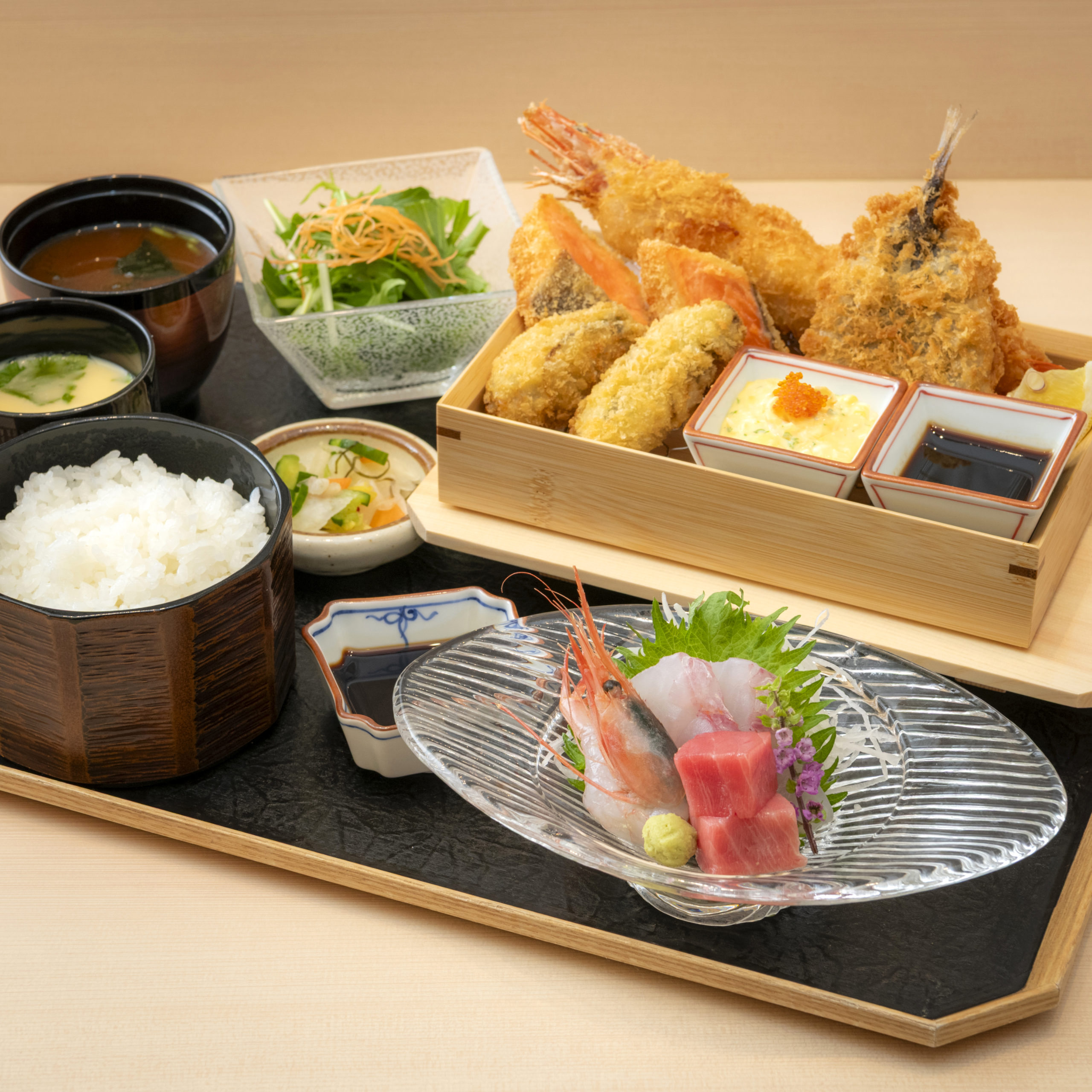 手作り海鮮ミックスフライ(若狭牡蠣、ふくいサーモンレアフライ、有頭エビフライ、アジフライ等)&三里浜 三年子花らっきょのタルタルと手作りソース、お造り3種盛り(越前本まぐろ、三国港産甘海老、三国産地魚)、福地鶏の茶碗蒸し、越前紅ずわいがにの調味油を使った自家製ドレッシングの越前水菜サラダ、北前赤味噌の味噌汁、きざみ昆布を使った浅漬け、坂井平野の米農家とむさんが作ったコシヒカリ特Aごはん