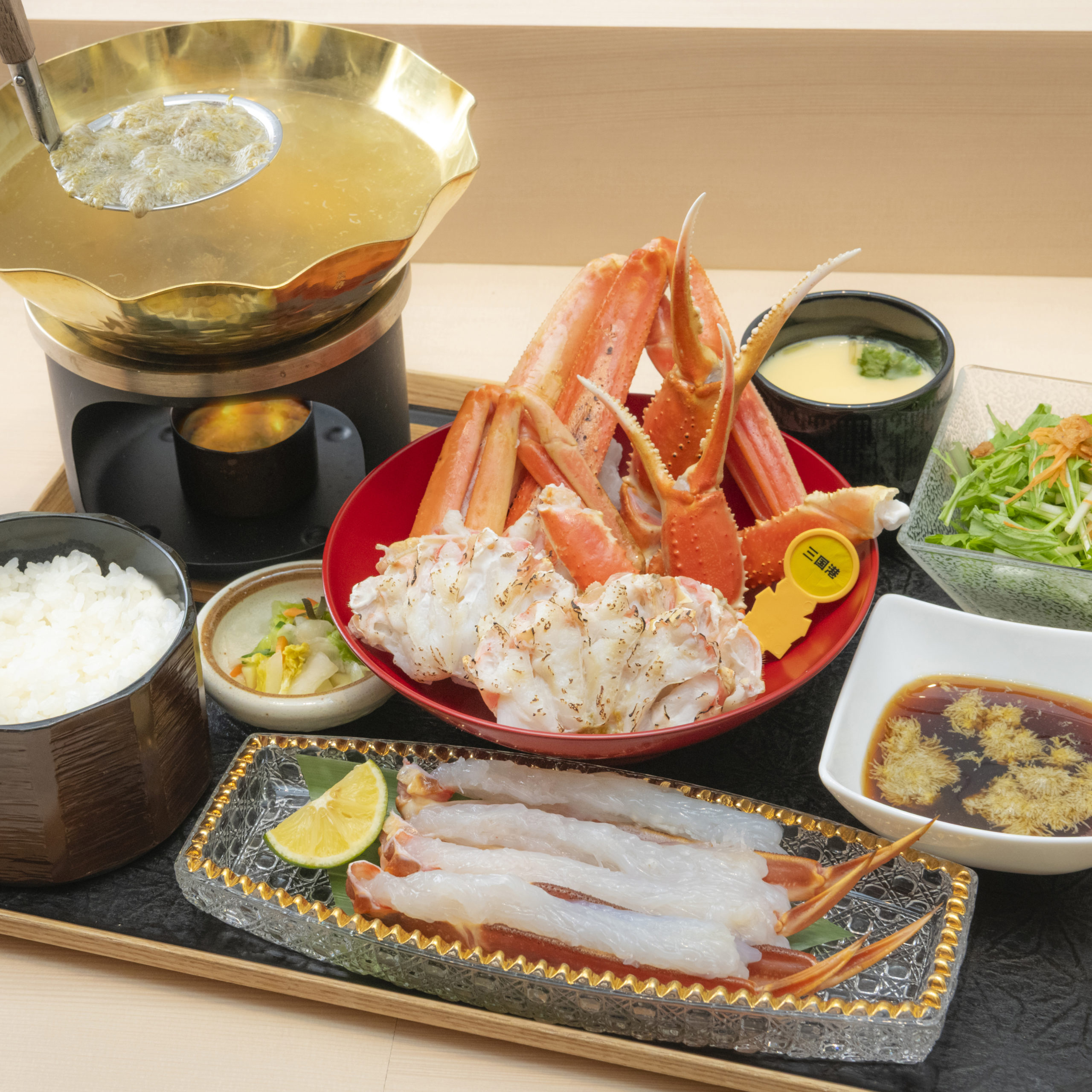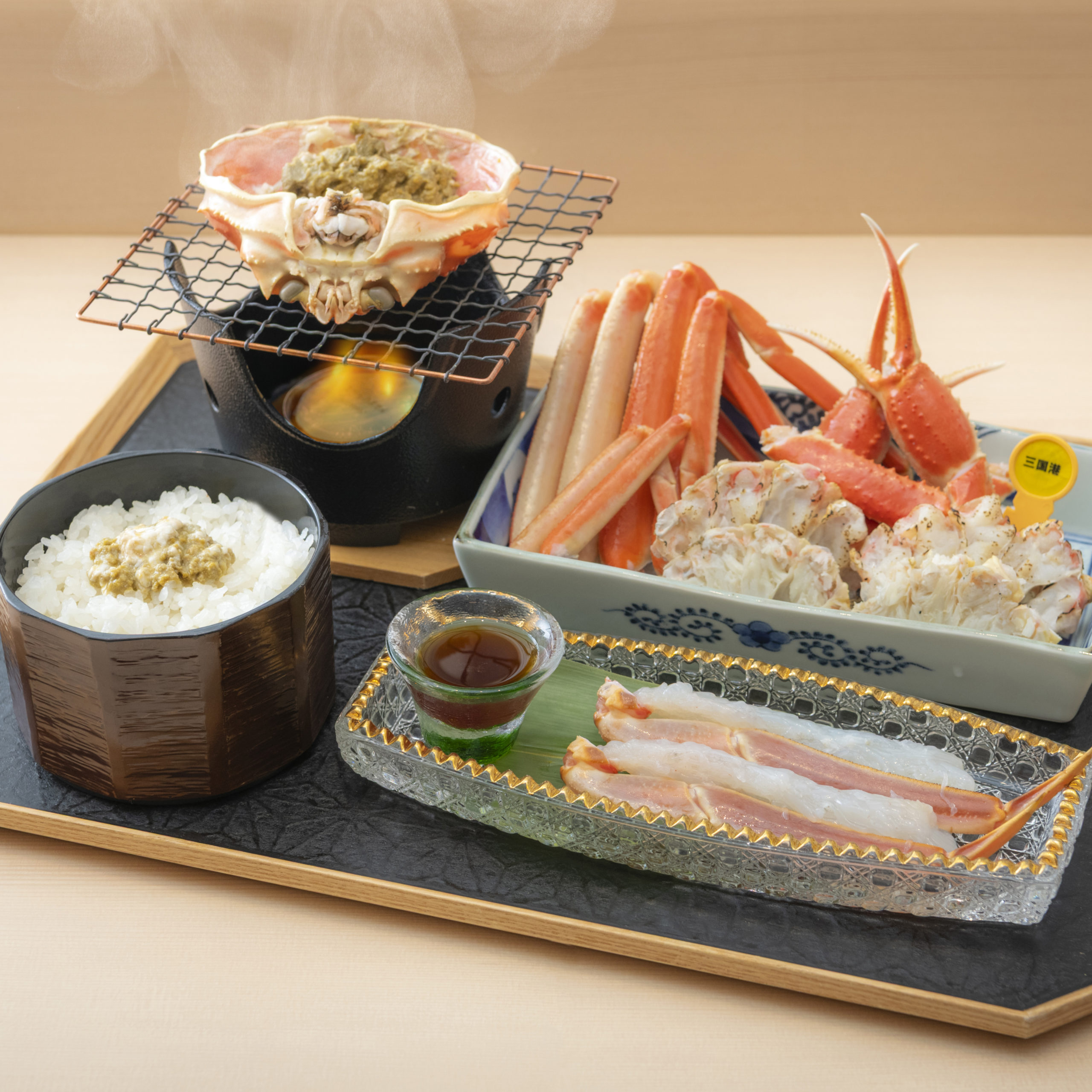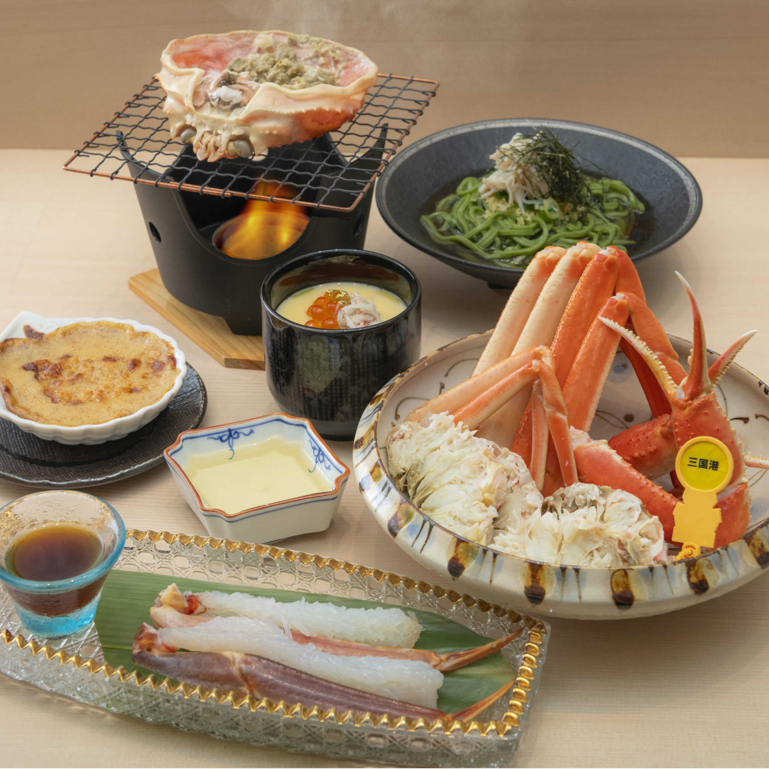 A mini course featuring a three-item crab set of boiled crab, grilled crab, and crab sashimi, served with crab gratin, crab chawanmushi (steamed egg custard), and a finishing dish of crab soba noodles.