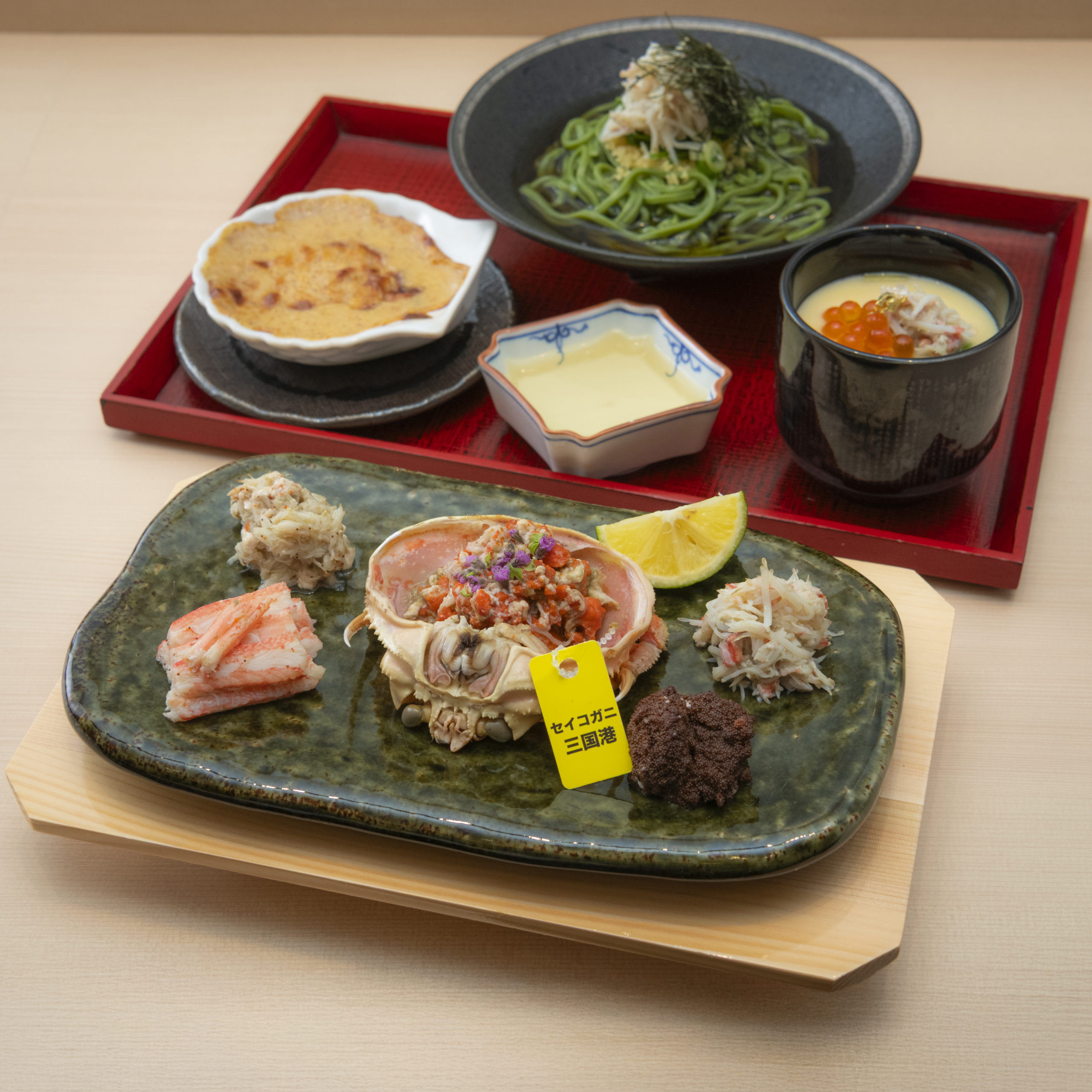A mini course featuring a four-item Seiko-gani tasting set, crab gratin, crab chawanmushi (steamed egg custard), and a finishing dish of crab soba noodles.