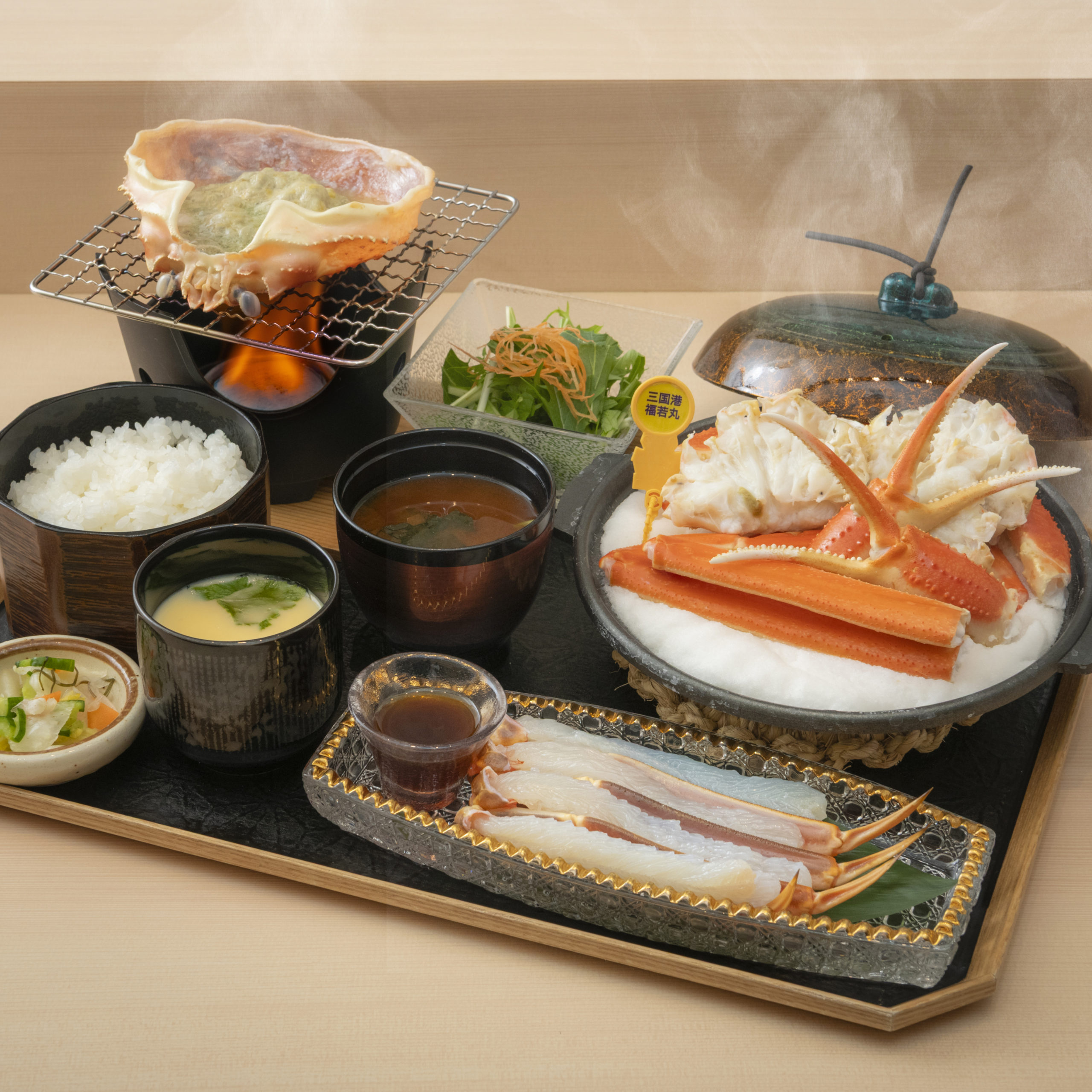 This set meal features a half portion (about 500g) of Mikuni Port Echizen Crab, served as a three-style full-course meal — boiled crab, grilled crab, and crab sashimi — accompanied by a small Seiko-gani (female crab) rice bowl. It was specially designed for guests who prefer a lighter meal or smaller rice portion.