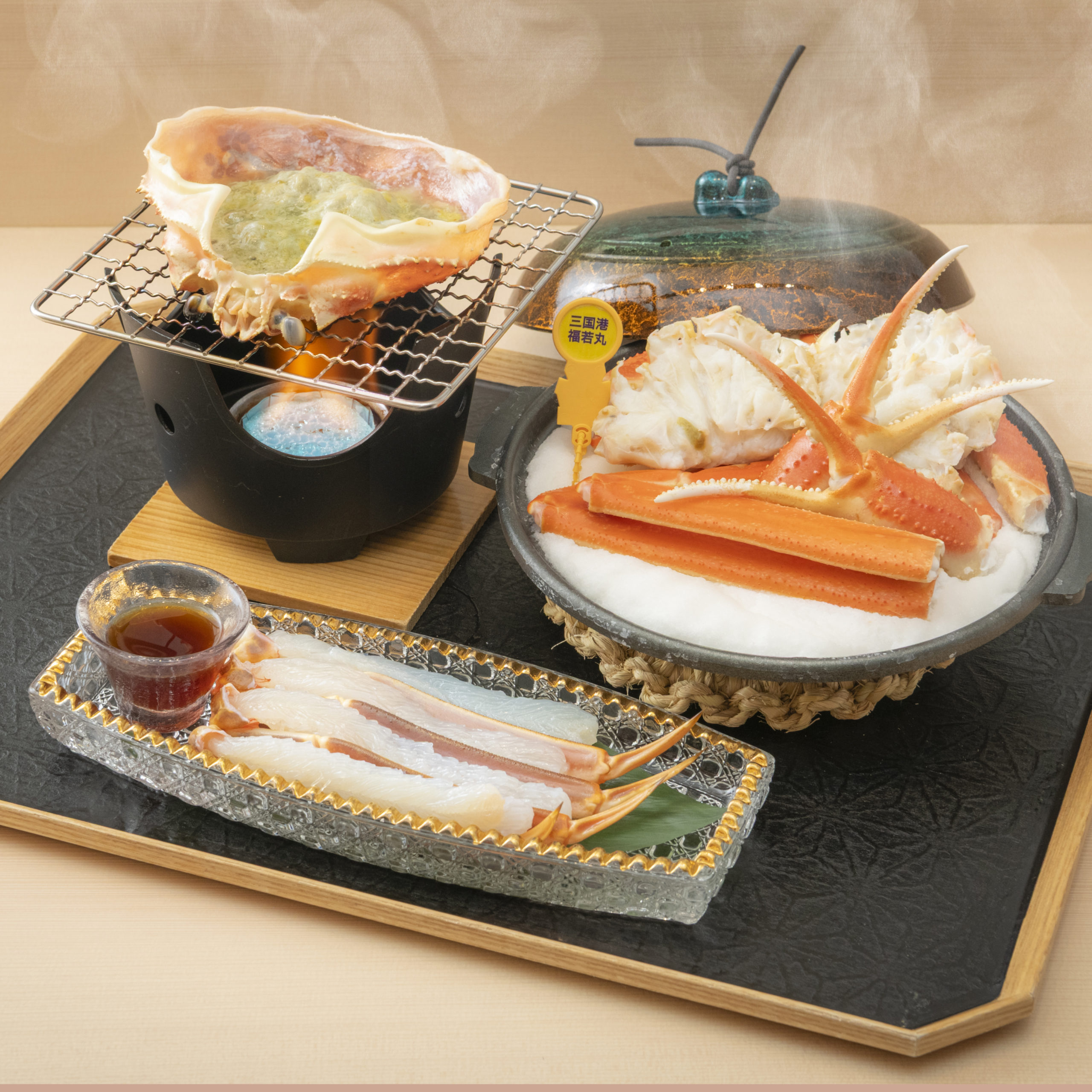 茹蟹・焼蟹・蟹刺し3点セット/Boiled Crab, Grilled Crab, and Crab Sashimi Three-Piece Set