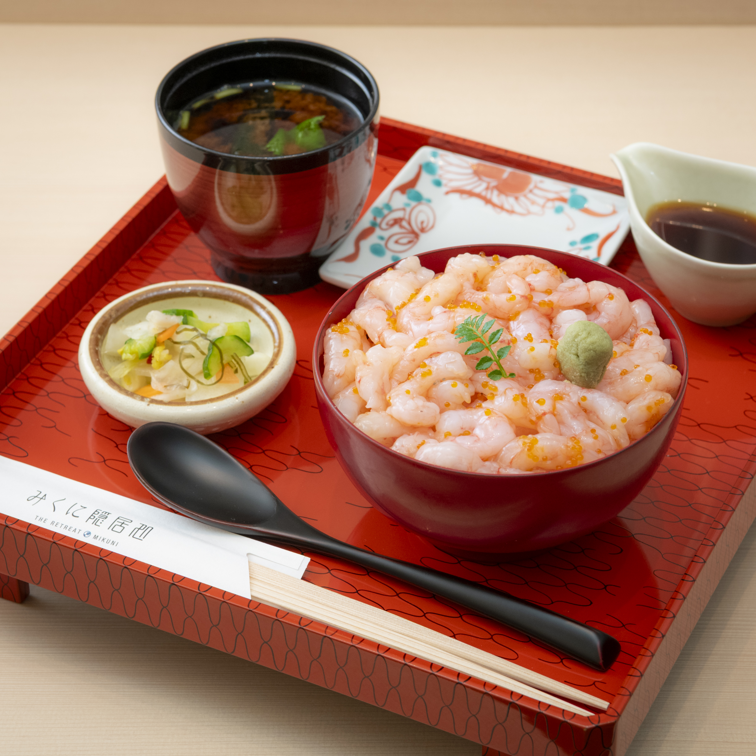 A seasonal menu featuring a rice bowl generously topped with peeled amaebi (sweet shrimp) landed at Mikuni Port.This menu is available only during the sweet shrimp fishing seasons, from April to June and from September to October.