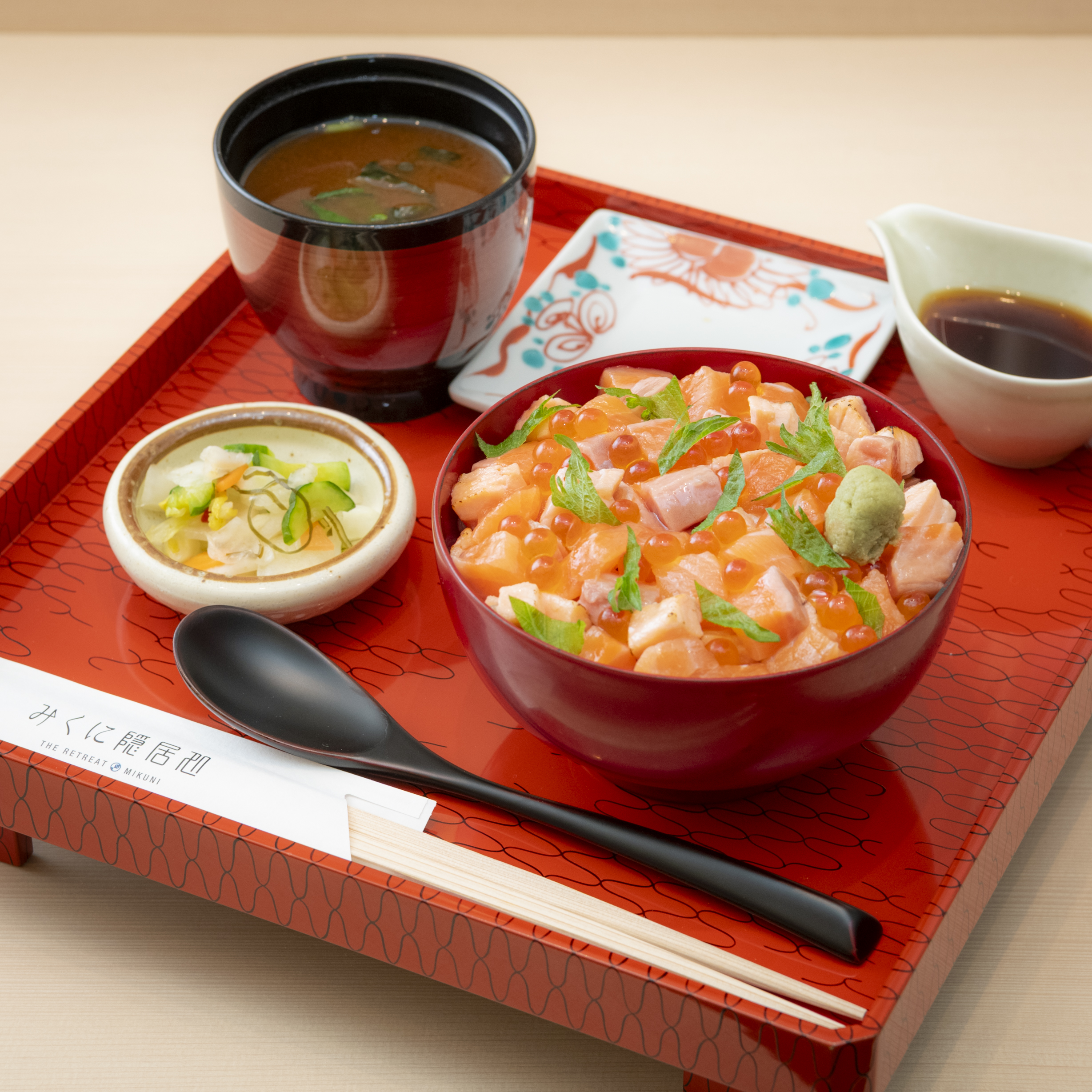 A seasonal menu featuring a rice bowl generously topped with peeled amaebi (sweet shrimp) landed at Mikuni Port, accented with vibrant pieces of fresh Fukui Salmon.This menu is available only during the sweet shrimp fishing seasons, from April to June and from September to October. Service will end during the summer once the stock is depleted.