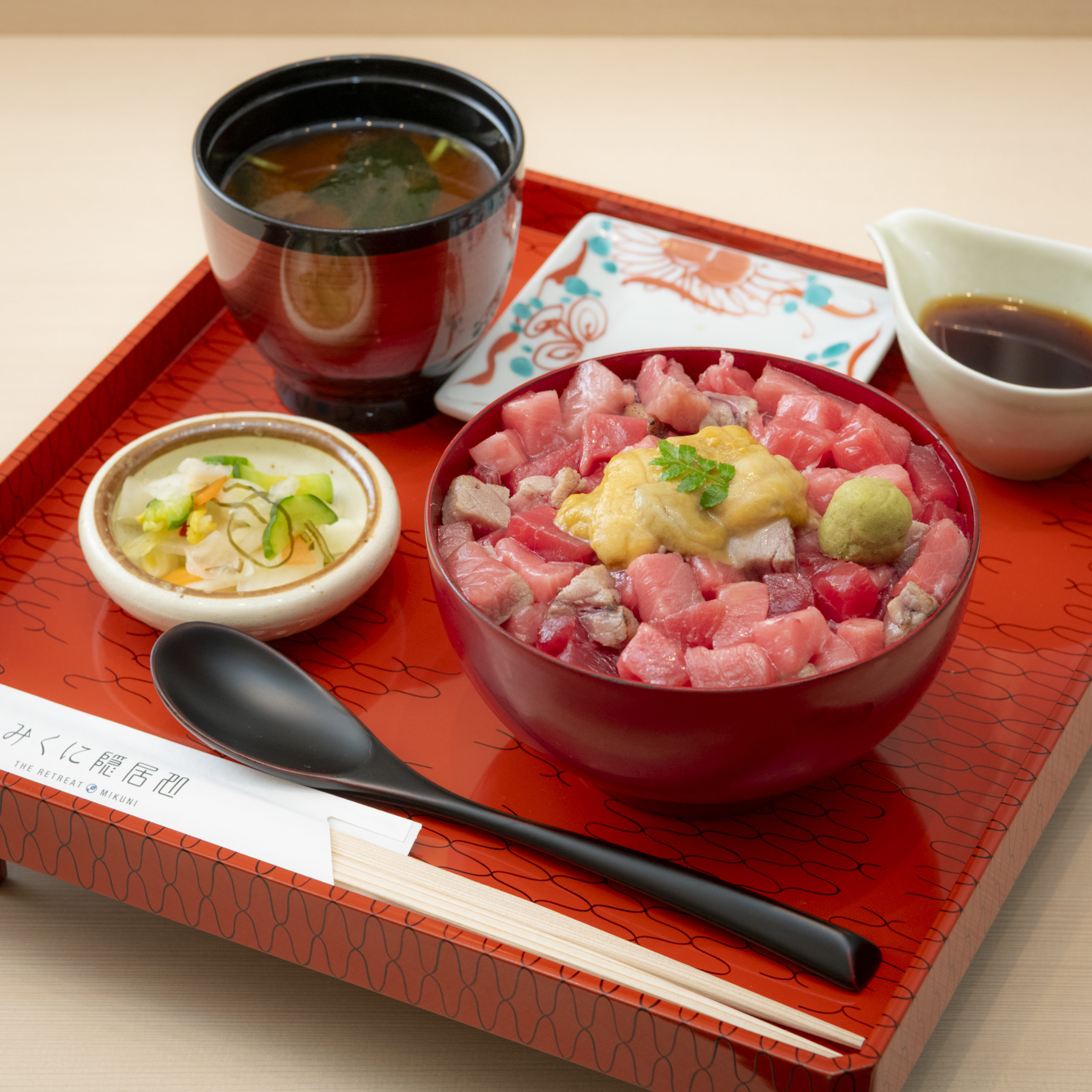 A premium “Echizen Bluefin Tuna Bowl” crafted with wild bluefin tuna carried north by the Tsushima Warm Current to the pristine coastal waters of Fukui. Indulge in the elegant harmony of both delicately seared and exquisitely fresh raw cuts, presented together in one refined bowl.